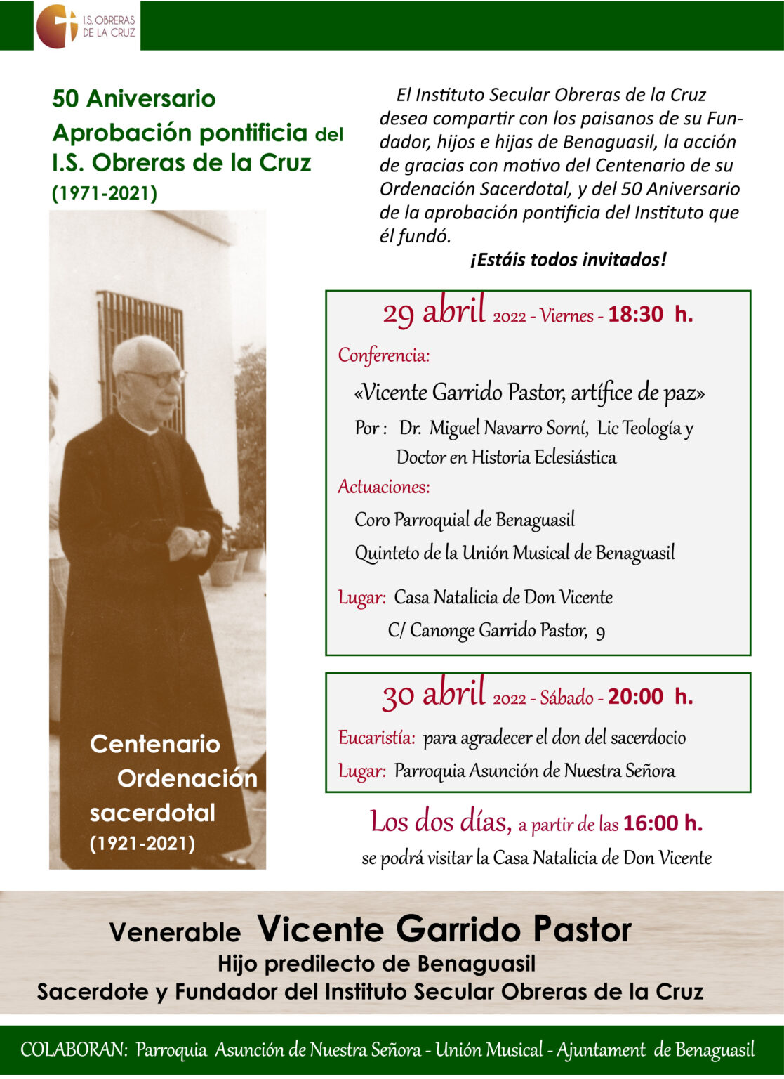 El Instituto Secular Obreras de la Cruz desea compartir con los paisanos de su Fundador, hijos e hijas de Benaguasil, la acción de gracias con motivo del Centenario de su Ordenación Sacerdotal, y del 50 Aniversario de la aprobación pontificia del Instituto que él fundó. Los actos serán los días 29 y 30 de abril.